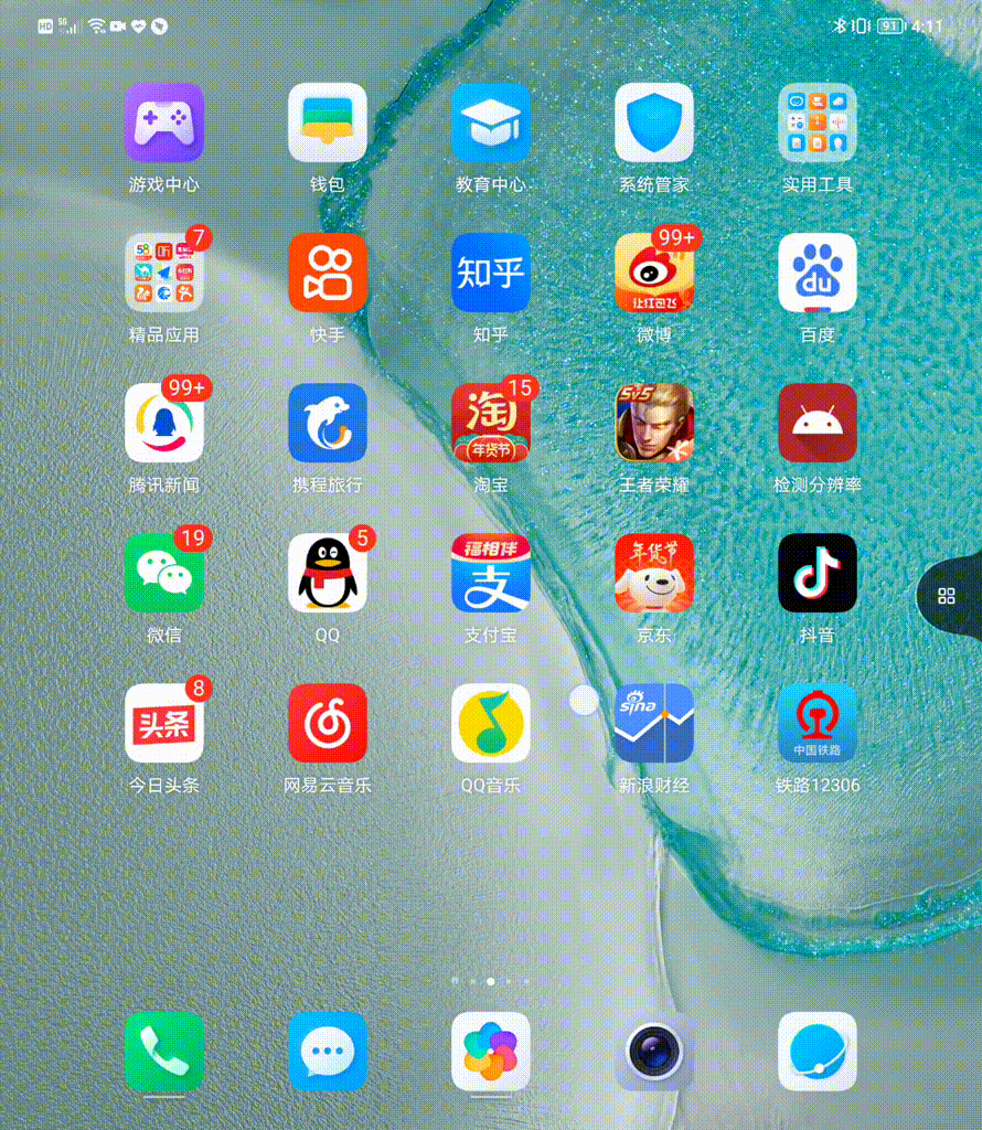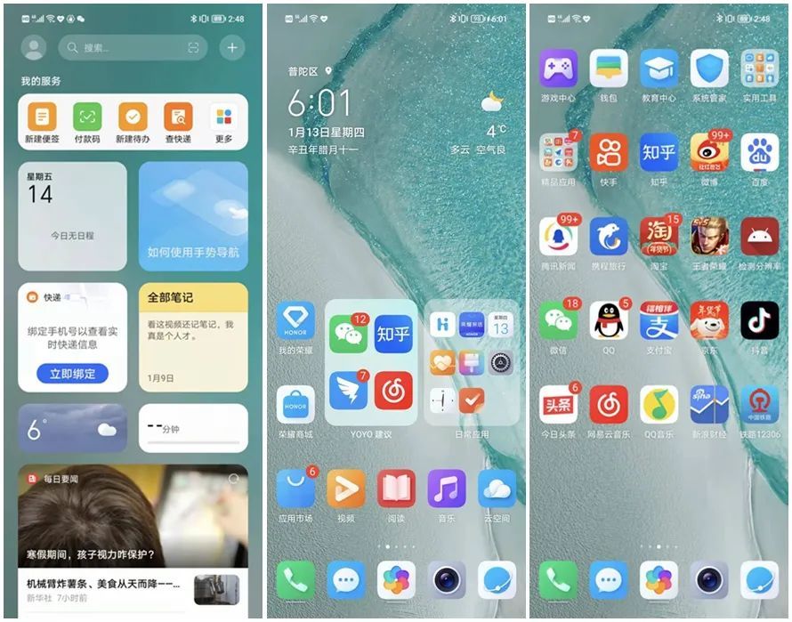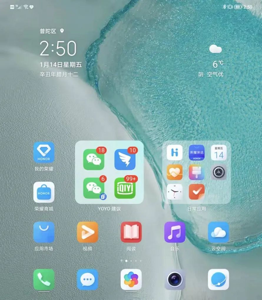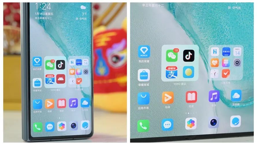 打开内屏,荣耀Magic V内屏的UI界面与外屏UI基本一样,就是简单的缩小与放大,这属于比较取巧的设计,简化了系统设计的难度,但是被分成“两半”的天气组件,相隔甚远的应用图标间距等等,虽然不影响使用,但是观感确实不太舒适。