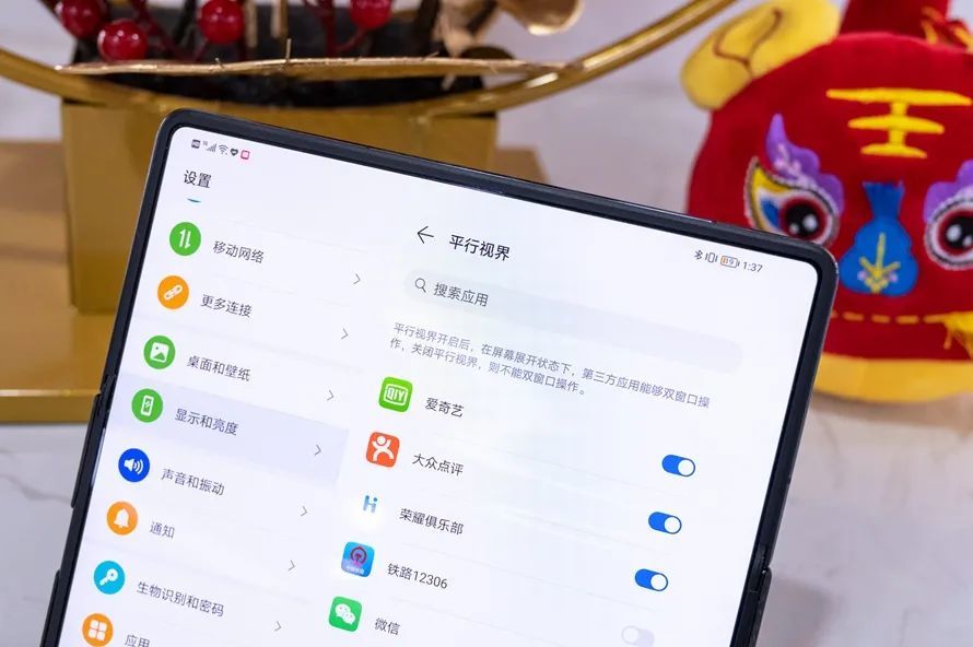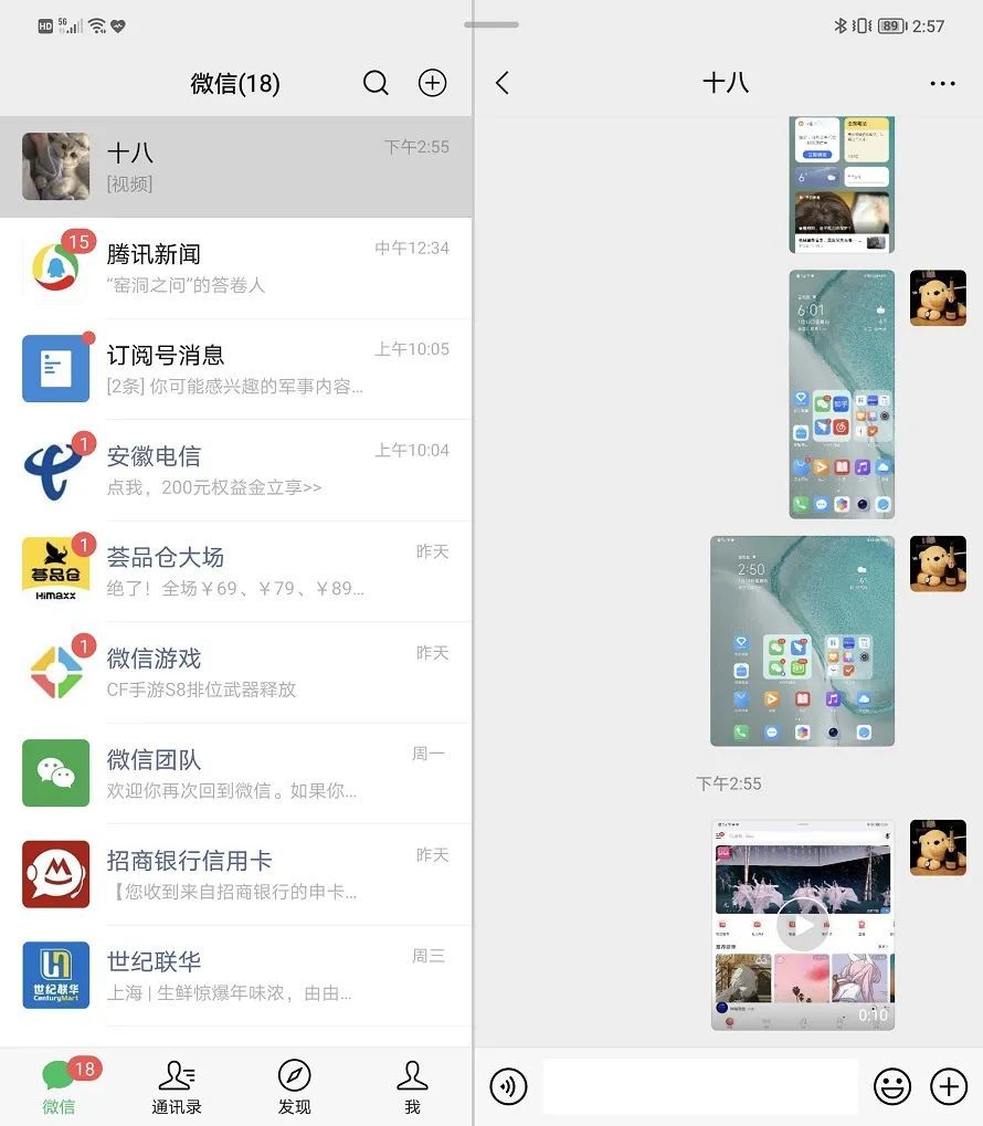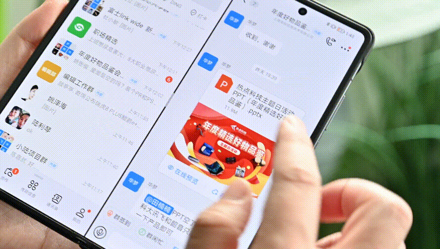 荣耀Magic V也加入了平行视界功能,开启此项功能之后,第三方应用能够以双窗口操作,这个功能确实挺不错。比如在微信、钉钉等聊天软件中,开启平行视界后,可以保持聊天信息栏与聊天对话框同时出现。而在爱奇艺软件中,我们也可在一边观看视频的情况下,选择下一个想看的视频。