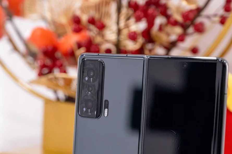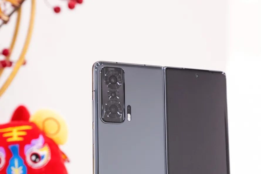 机身背面采用的是亮面玻璃,很是清楚,甚至可以充当镜子使用,但是粘指纹问题依然未能得到解决,后置模组则采用了1+1+1的三摄竖列摆放,甚至后置模组都做了曲面弧度的设计,看起来就像折叠形态机身背面的缩小版,为了手感已经无所不及,这点值得点赞。
