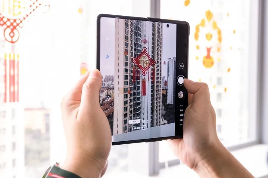 值得一提的是,如果在屏幕展开状态下拍摄,相机界面进行了定制化设计,将拍摄按钮、模式等竖列放置在机身的右侧,拍摄相对来说也更易操作。但需要注意的是,相当于手机竖屏拍摄。
