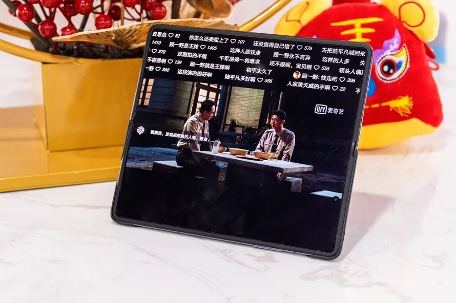 而在观看电影、综艺、电视剧等视频时,荣耀Magic V的大屏并不能将画面放大很多,更多的是避免了弹幕对画面的遮挡。而比较尴尬的是,由于Magic V将两个扬声器分布在机身的右侧顶端与底端,竖着播放时只能感觉左侧有声音,而如果横着播放时,内屏的挖孔又会对播放画面遮挡,下一款手机建议优化。