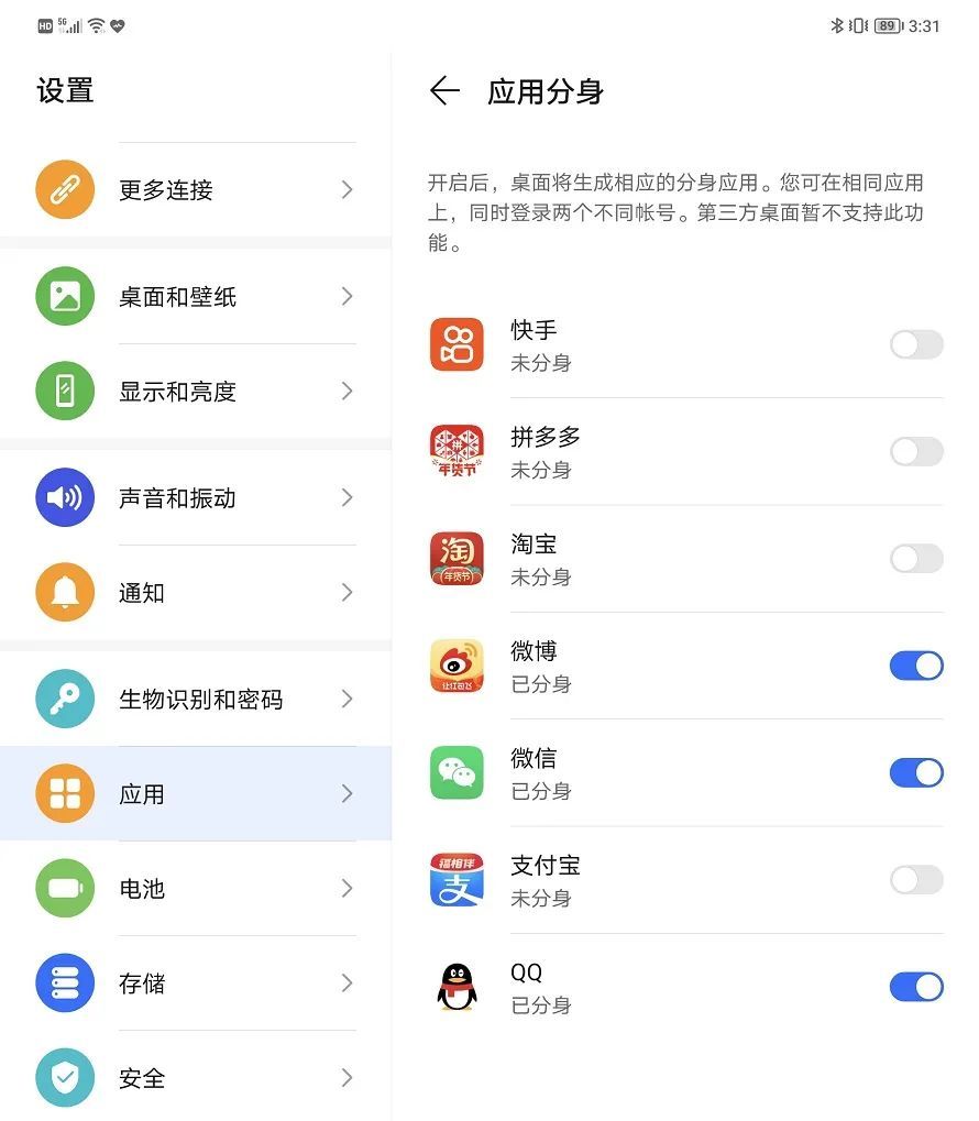 除此之外,应用分身配上大屏的分屏,两个简直是绝配。荣耀Magic V的分身应用也比较丰富,其中就包括大家常用的微信、QQ、微博等,有两个微信号、QQ号、微博号的伙伴们,可以通过分屏直接操控两个账号,再也不需要来回切换账号或者窗口。除此之外,还有快手、拼多多、淘宝、支付宝等应用可以分身。