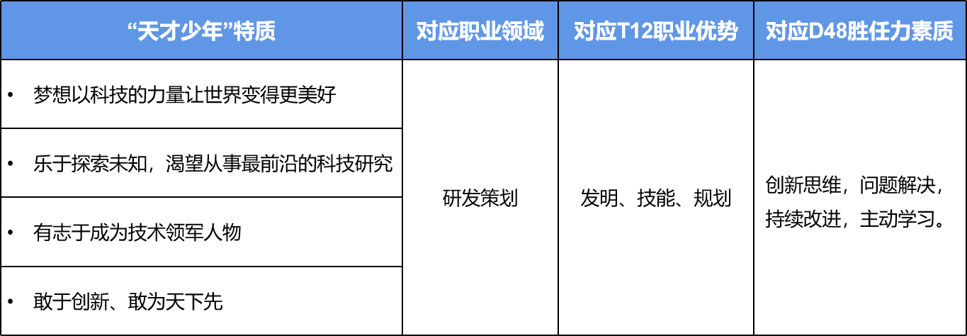 或许这样看着会有点概括,所以我们用T12素质词典进行对应,得出以下“天才少年”模型: