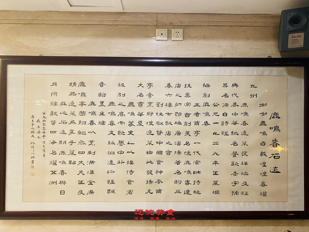 中国特一级烹饪大师、国际烹饪艺术大师、国家级非遗传承人刘敬贤先生为鹿鸣春饭店题词,据悉在辽菜先师、刘敬贤大师和各位辽菜精英的辛勤努力之下, 《中华辽菜大典》将在今年面世,这是一部集中展示与传承“辽菜”优秀传统烹饪文化和制作工艺的专著,详实总结了辽菜的文化历程。
