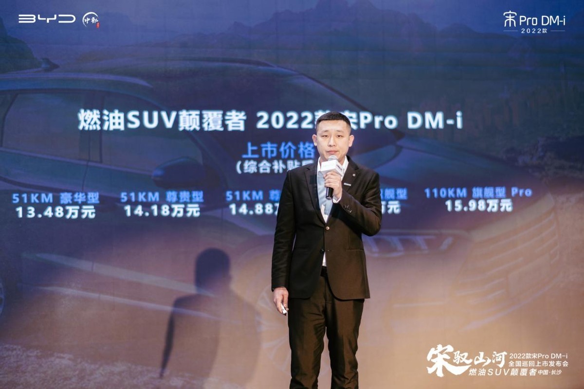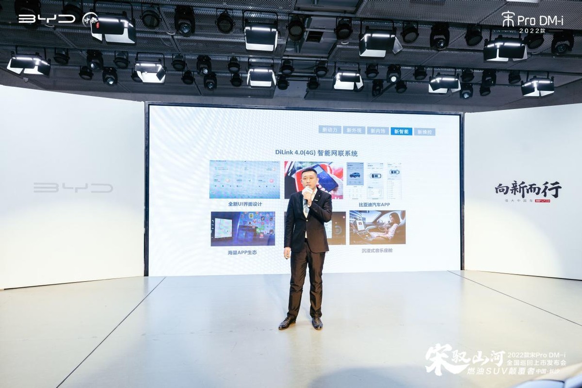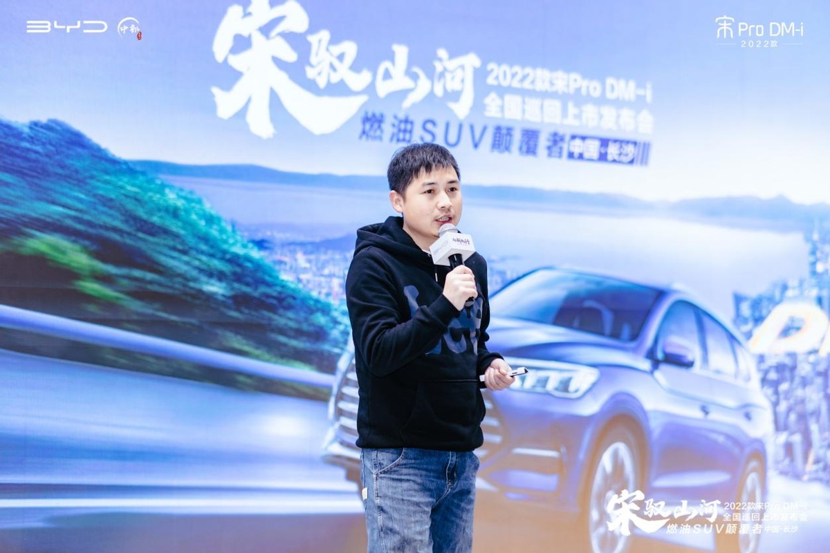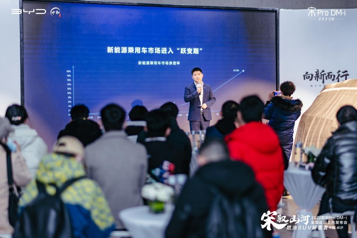 比亚迪王朝网销售事业部中部战区湖南大区经理马湘徽开场致辞,为大家分享比亚迪2021年新能源汽车销售取得的优异成绩,对新能源汽车行业给出了自己的理解和思考。他表示,2022款宋Pro DM-i将作为比亚迪“双宋战略”的重要一员,重新定义主流SUV新价值。同时诚心地感谢各位媒体朋友们长期以来对比亚迪的厚爱,正因诸位的支持与信赖,才造就比亚迪的今日辉煌。伴随着愉悦的音乐,灯光的映照下,身穿典雅汉服的模特迈着优雅的步伐登上舞台揭开了今日主角的神秘面纱,标志着宋Pro DM-i正式登陆长沙。