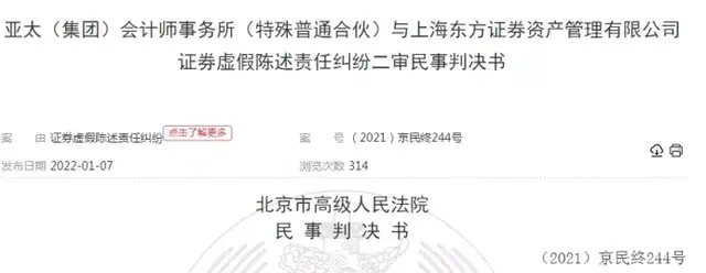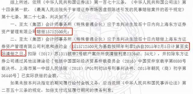 为了追回经济损失,东方证券资管以证券虚假陈述责任纠纷为由,一纸诉状将亚太会计师事务所告上法院。经北京二中院审理后,判决亚太会计师事务所向东方证券资管赔偿1571万余元,以及应付利息和违约金。