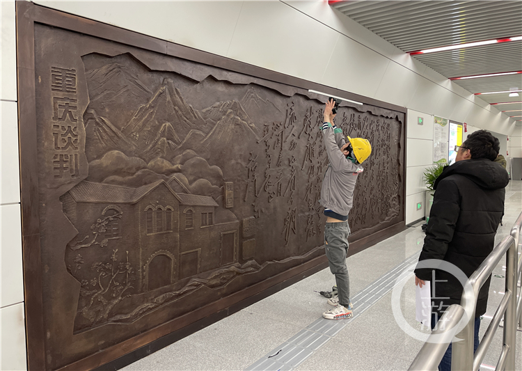 上午10点,上游新闻记者从9号线一期工程红岩村站2号出入口进入,在经过三段电扶梯组成的通道时看到,工人们正准备安装墙面浮雕。