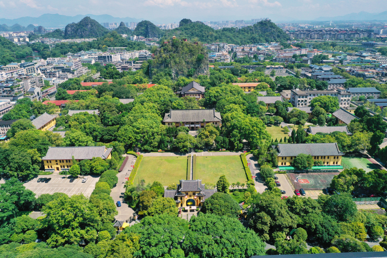 独秀峰是桂林城市的中轴线,也是桂林的风水山。山体扁圆,峭拔竣秀,与桂林著名叠彩山、伏波山三足鼎立,有南天一柱之美誉。