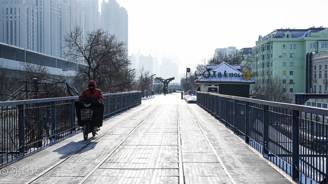 当走在玻璃栈道时感受到了“老江桥”那段不平凡的历史,站在桥上透过脚下的玻璃栈道,可以直接看到脚下松花江面,感觉到寒冷与严肃,仿佛新旧交替的“老江桥”从眼前一晃过,向游人讲述着那段百年前的历史。