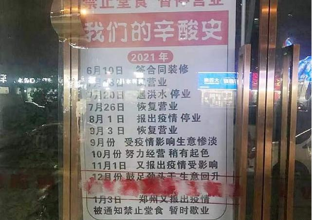 6月10日 签合同装修,7月18日 试营业,7月20日 遇洪水停业,8月1日 因为疫情停业,9月份 受疫情影响生意惨淡,11月1日 曝出疫情受影响,1月3日 郑州又出现疫情,被通知禁止堂食,暂停营业...