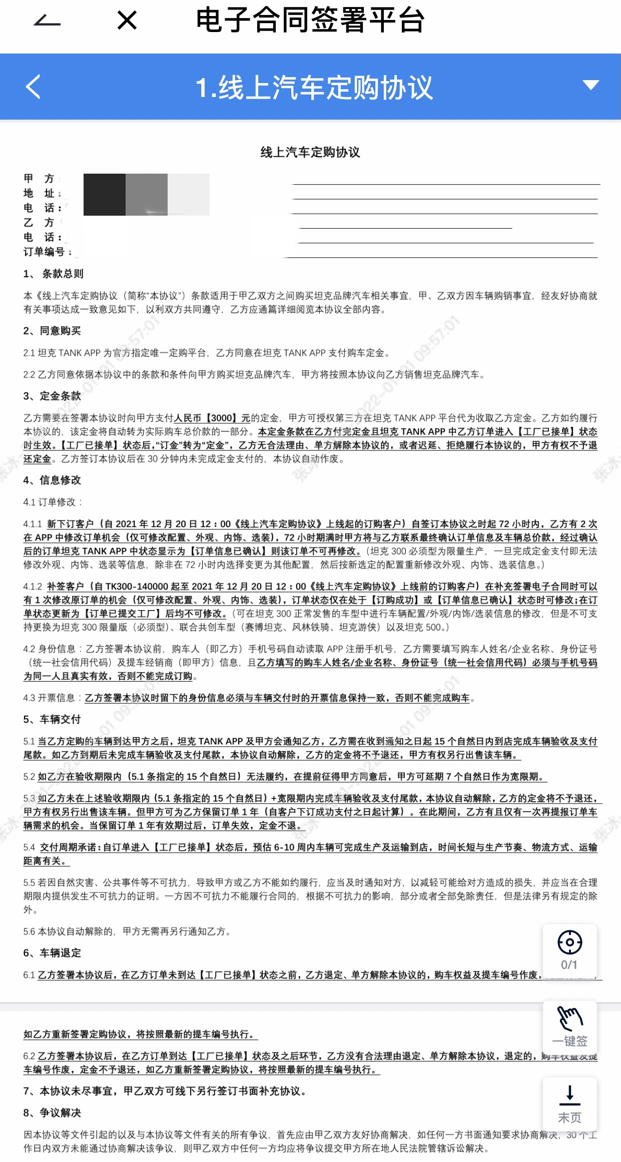 坦克300线上汽车定购协议。图片来源:APP截图
