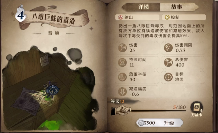 而在游戏中这张卡的效果就简单明了,使用之后扔出一瓶八眼巨蛛毒液,对范围内所有敌方单位持续造成伤害和减速效果,对于新手来说也是一张简单好用的单卡。