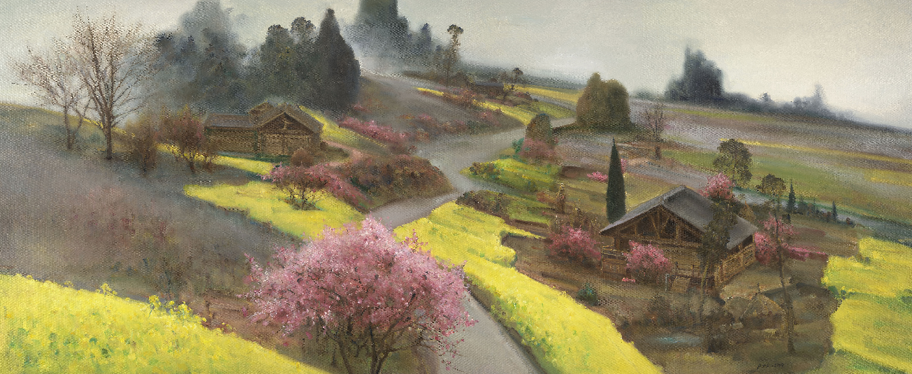 重庆是一座集大城市与大农村于一体的城市,城市二元制结构非常突出,但是重庆却实行市区(县)乡相结合的匾平化管理,降低了行政管理成本,提高了管理效益,让大农村在脱贫攻坚和乡村振兴中变得更绿、水更青,把习近平总书记倡导的既要金山银山,更要绿水青山,变成了“山水宜居之”、“梦幻之城”、“魅力之都”。梁益君创作的油画《绿了车田乡》作品以渝东南酉阳车田乡的景色为创作对象,构图饱满、色彩明亮,画面宁静而充满生机。近处的秧田初插,生机勃勃;中远处的袅袅炊烟刻画出山村的静谧;高远处的山坡上坐落着些农家,周围的树木郁郁葱葱。寓意着乡村人民对生活的热爱与对乡村发展建设的希望。查明创作的水墨画《田埂十月》不烘托浓重的色彩,不制造强烈的对比,将自己的用笔、用墨、用色催生出宁静、淡雅的画面意味,这就是作品给人的印象。作品以率真轻松的笔法描绘出了巴渝乡村农闲时萧疏的自然景象。罗晓航创作的油画《土家村寨之看家上狗》作品以重庆石柱县中益乡土家村寨为创作素材,画面中的房屋主人上山务农,唯有一只小狗慵懒地躺在屋门口看家。远处连绵陡峭的山峰一派青绿,屋檐下的玉米和门前的油菜花为宁静的乡村增添了更多色彩。画家笔触随性有力,或快或慢,或点或线,简约的构图让整个画面和谐而富有生机,展现出乡村人民对生活的热爱,对乡村发展充满着期望。