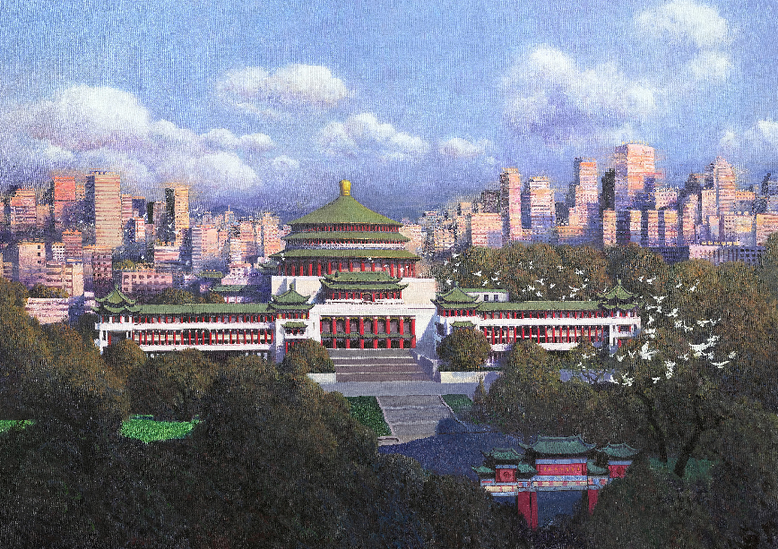 重庆是一座集传统与现代、浪漫与时尚、古朴与青春、奔放与热烈融为一体的国际化大都市,这座城市的建筑、桥梁、火锅、温泉、美女等,不仅给这座日新月异的城市增添了无穷的魅力,而且也给画家增添了源源不断的创作灵感。画册入选的翁凯旋创作的油画《重庆人民大礼堂》,作者运用写实手法,表现出大礼堂的庄严与宏伟。清晨的人民大礼堂,旭日初升,天空一片蔚蓝,一群白鸽自由地飞起,身后的城市安宁和平,欣欣向荣。也寓意国家繁荣兴盛、国泰民安。画册入选的余都创作的水彩画《畅达腾飞之城·重庆——不仅凸显重庆桥都的魅力,也展示了网络重庆的现代立体交通纵横交错、四通八达的嬗变。