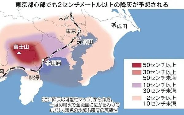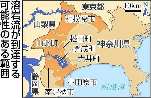 京都大学的火山专家镰田浩毅教授表示,富士山如果再发生与上次规模类似的喷发,岩浆将一直流到神奈川县,火山灰将覆盖东京在内的整个首都圈。