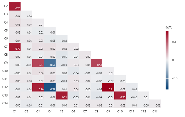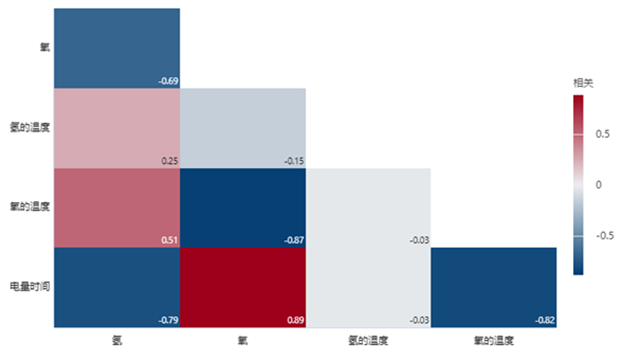 注意到了吗?您的眼睛可以迅速移到底部深红色方格(电量时间与氧图)的位置。在相关图中,色彩浓度与相关系数成比例,方格颜色越深表示相关越强。因此,相关图为相关提供了清晰、便于浏览的直观表示。在这个案例中,工程师只需运行相关图,就能轻松理解数据中的相关。