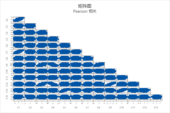 将相关图用于较大数据量现在,我们考虑一个含 14 个变量及 1,000 行数据的分析。具体细节并不重要,它可以是消费品调查结果,也可以是电路板过程的测量结果。如果您让您的团队从以下矩阵图中直观地选出最强(接近 +1 或 -1)关联,那么他们需要多长时间才能确定最强相关?