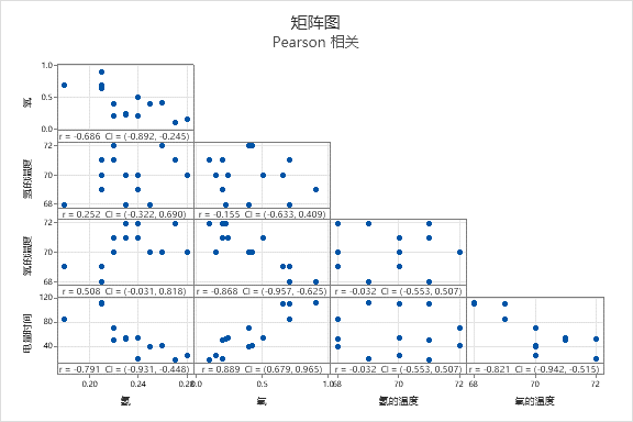 矩阵图可显示单个关联,是实现此分析可视化的实用工具。在下方的示例中,请注意电量时间与氢含量的图位于左下角。