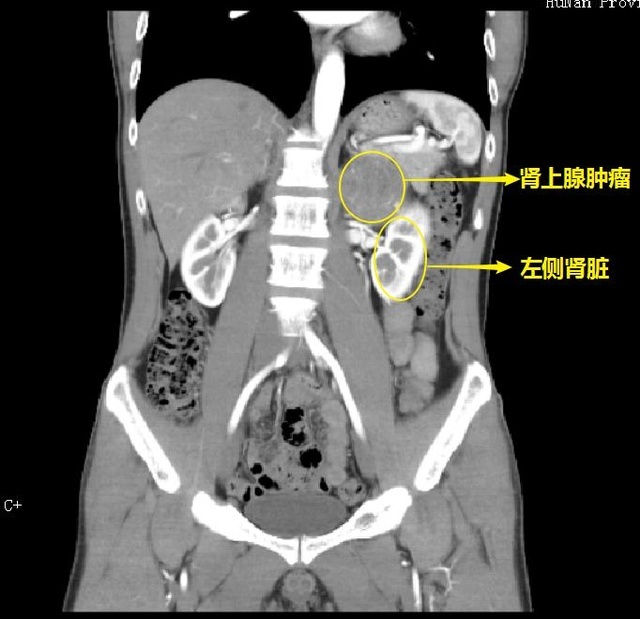 CT检查结果显示肿瘤直径约7cm,向上推压膈肌和脾脏,内侧推压腹主动脉,如果不及时采取手术治疗,肿瘤在体内如同一个定时炸弹,不仅会继续长大,随时还会使血压急剧升高并发心、脑血管意外危及生命。