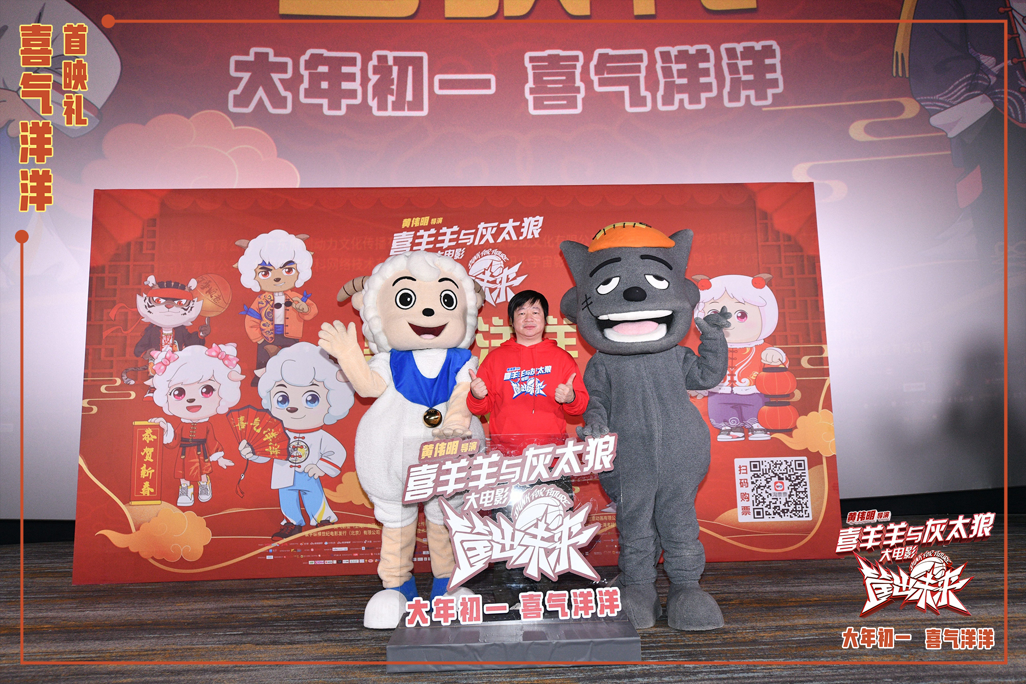 新京报讯(记者周慧晓婉)1月23日,即将于大年初一上映的《喜羊羊与灰太狼之筐出未来》在北京、广州成功举办“喜气洋洋”两场首映礼。被称为“喜羊羊之父”的电影导演黄伟明奔赴两地,跟观众近距离交流互动,两大主角喜羊羊、灰太狼也惊喜现身,引发现场阵阵欢呼。