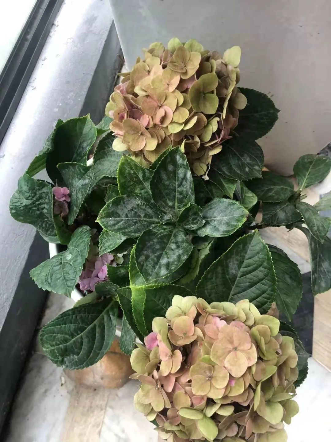 上面是感染白粉病的绣球花(群里花友的图片)