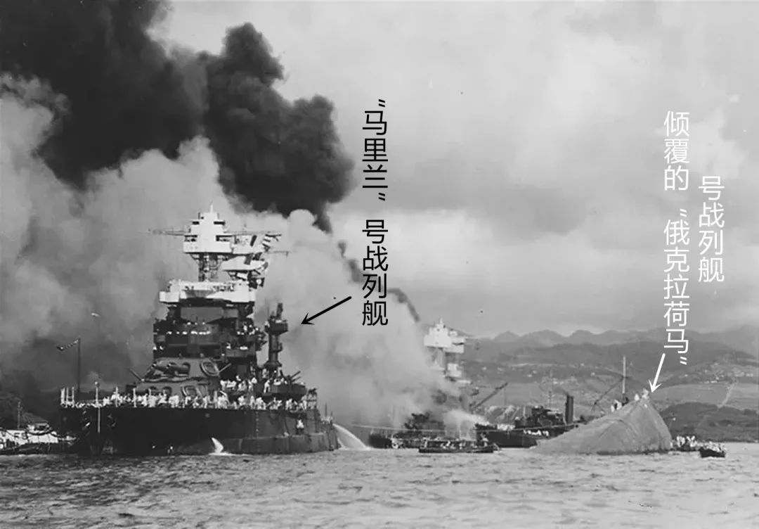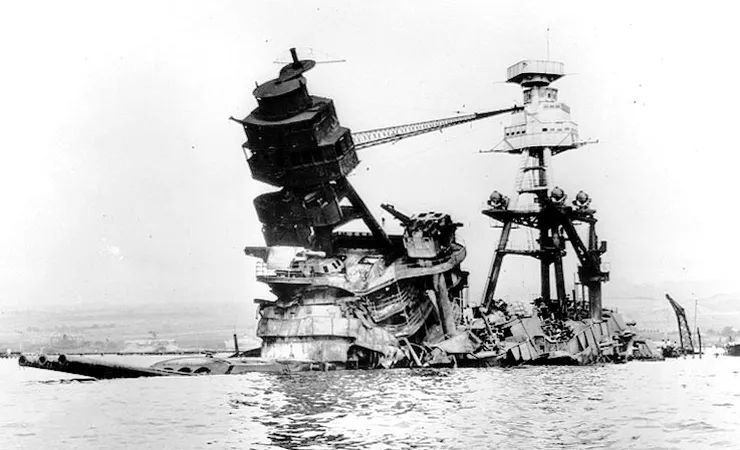 我回到“企业”号后,其他曾飞到珍珠港的VS-6中队的飞行员也回来了。他们带来了不幸的消息:有6人——2名飞行员和4名机枪手——阵亡。接下来,我们也亲眼目睹了日本人对太平洋舰队其他舰艇所做的一切。当天晚上,当“企业”号驶入狭窄的水道并向泊位靠近时,我们看到了战列舰的残骸,位于福特岛东侧的8艘战列舰均被日本飞行员击沉或炸毁。我看到“俄克拉荷马”号(BB-37)倾覆在海中,其龙骨奇怪地凸出水面,3枚鱼雷命中了该舰,使其倾覆(图1,图2)。在更远的地方,战列舰“亚利桑那”号(BB-39)残缺不全的上层建筑半沉在水中,它被一枚炸弹引爆了前部弹药库,这艘船现在成了1177名英勇水兵的金属坟墓(图3,图4,图5,译者注:后来,美军拆除了“亚利桑那”号战列舰的上层建筑,而船体依旧躺在珍珠港的海湾之下。1962年,时任美国总统肯尼迪下令在该舰残骸上建立一座纪念馆,从此成为珍珠港最著名的景点之一)。此外,日本人的空袭还破坏或击沉了9艘较小的船只,摧毁了180多架飞机,把机场的跑道炸得坑坑洼洼,造成2400名美国人死亡。当我知道日本人是如何杀害我VS-6中队的队友时,我震惊万分。而现在,我又目睹了舰队相四分五裂、浓烟滚滚、触目惊心的画面,这样的惨状,是我根本无法想象的。