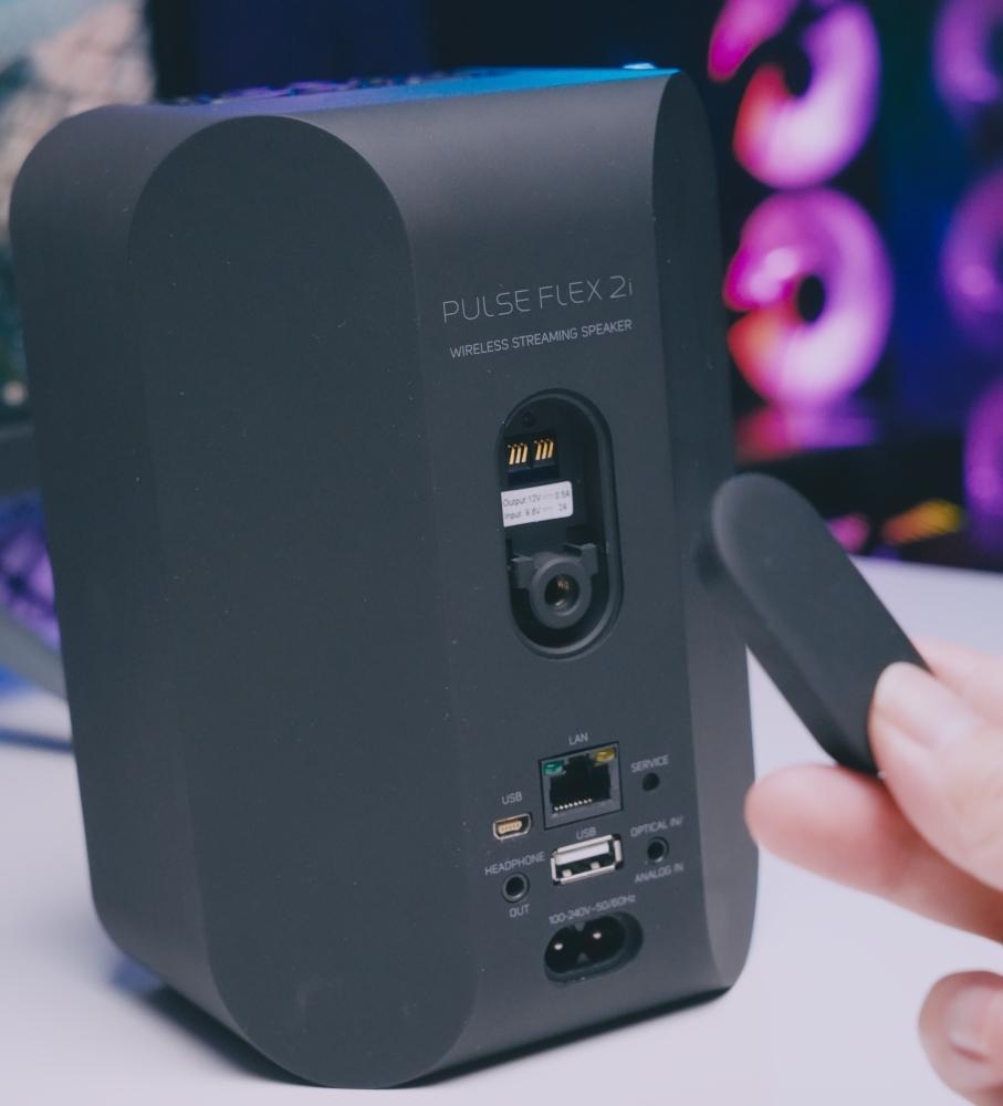 当然打游戏的时候,还是得接线的,以确保尽可能地低的延迟。接口区域,Bluesound PULSE FLEX 2提供了MINI-USB接口、3.5mm光钎/AUX输入口以及耳放接口。晚上不方便使用音响的时候,可以直接把耳机接在音响上,不需要跑到地上或者机箱后面去摸索耳机接口了。