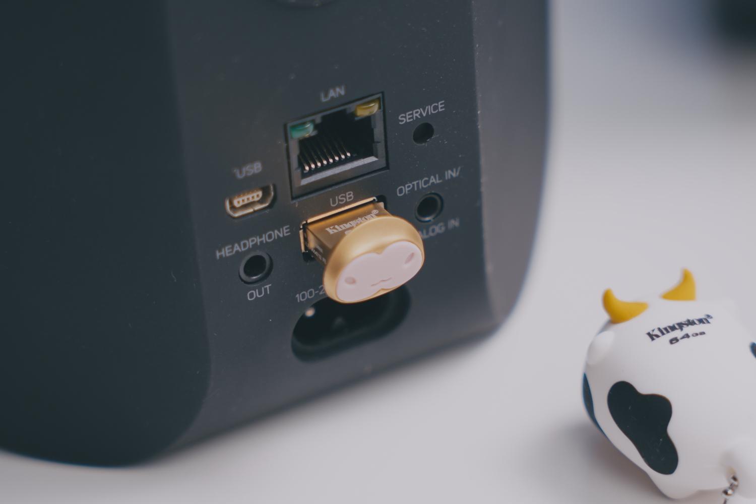 特别值得一提的是这个USB-A接口和这个LAN有线接口,USB-A接口可以直接读取U盘/移动硬盘里的音频文件,支持支持MP3/AAC/WMA/WMA-L/OGG/FLAC/ALAC/WAV/AIFF/MQA等众多格式。LAN有线接口和WIFI除了可以用来访问家里的NAS,还可以实现多设备,多房间串流,并且无需额外配置串流设备。