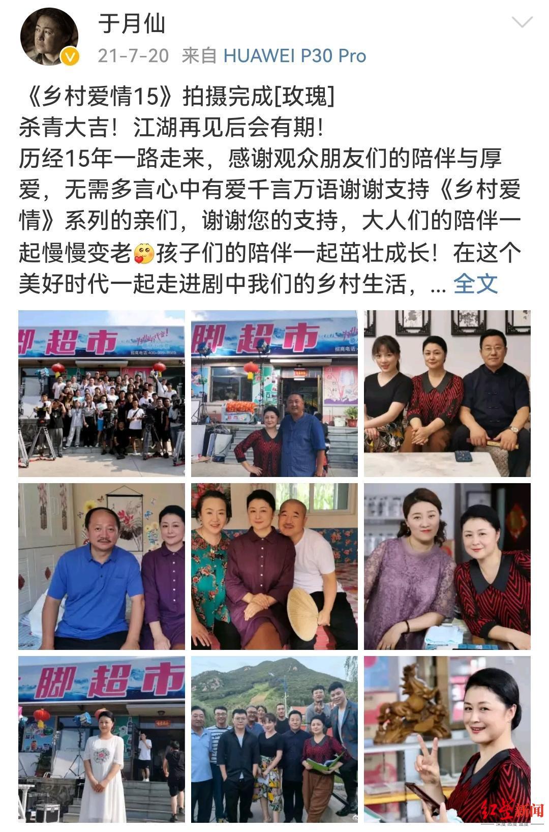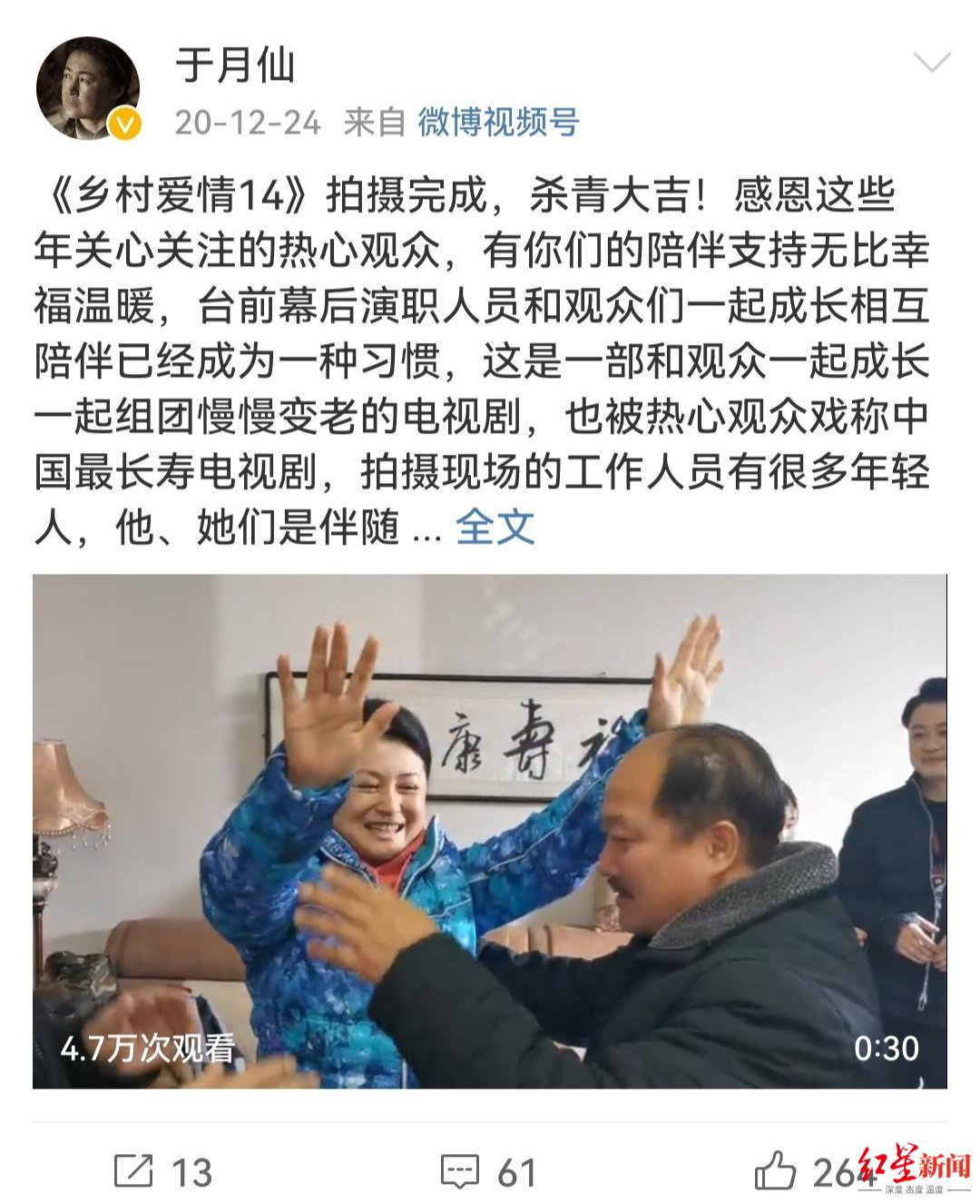 红星新闻记者注意到,早在2020年12月,《乡村爱情14》杀青时,于月仙发布了多条微博感谢剧组和观众,“有你们的陪伴支持无比幸福温暖,台前幕后演职人员和观众们一起成长相互陪伴已经成为一种习惯,这是一部和观众一起成长一起组团慢慢变老的电视剧,也被热心观众戏称中国最长寿电视剧……”