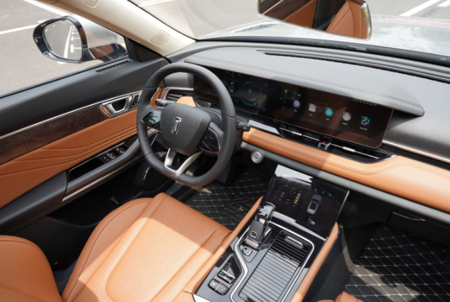 奔腾T99的内部的氛围感很足。首先是用料方面,皮质材料的方向盘握感很好,中控台为软性材质,配色上木纹饰板和钢琴烤漆,整体内饰档次感很到位。
