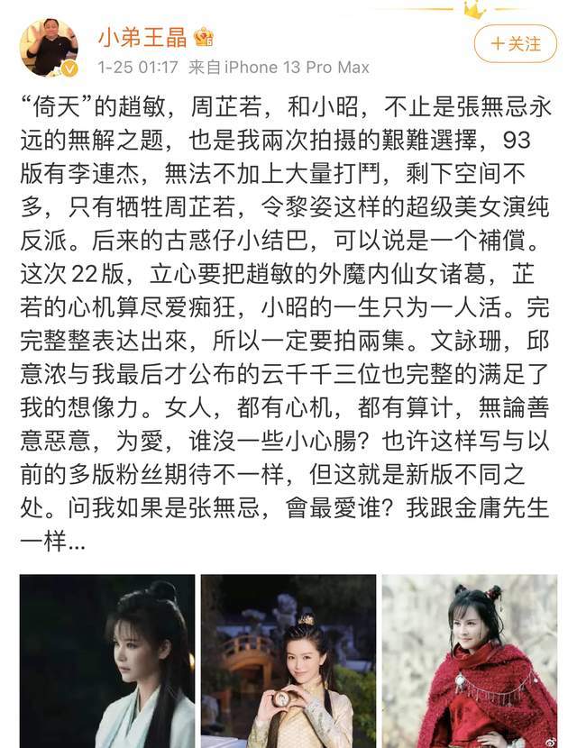 1月25日,知名导演王晶在社交平台发文谈到了新版《倚天屠龙记》三位女性角色的选角,大赞女演员们完全符合他的想象。