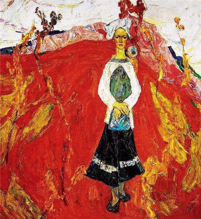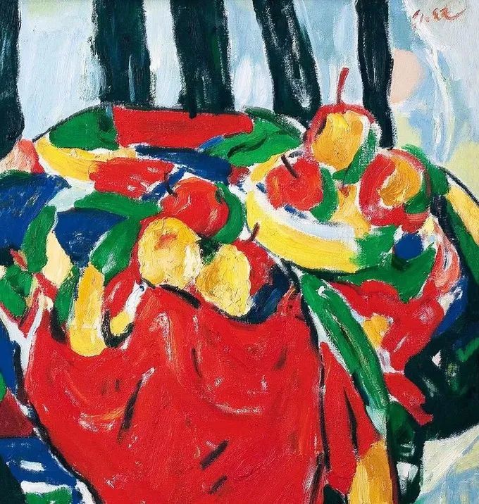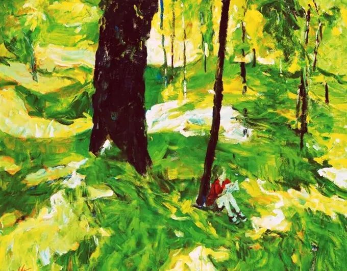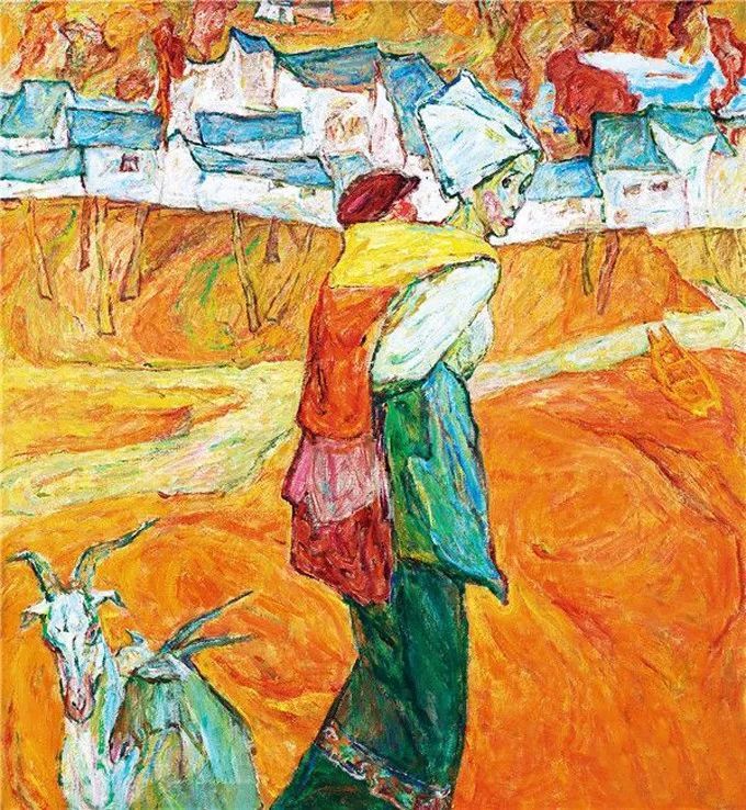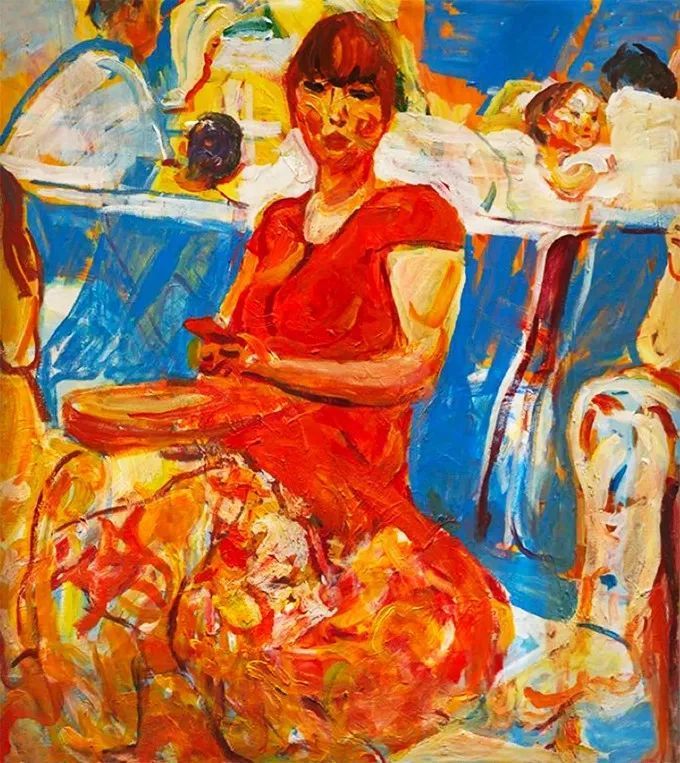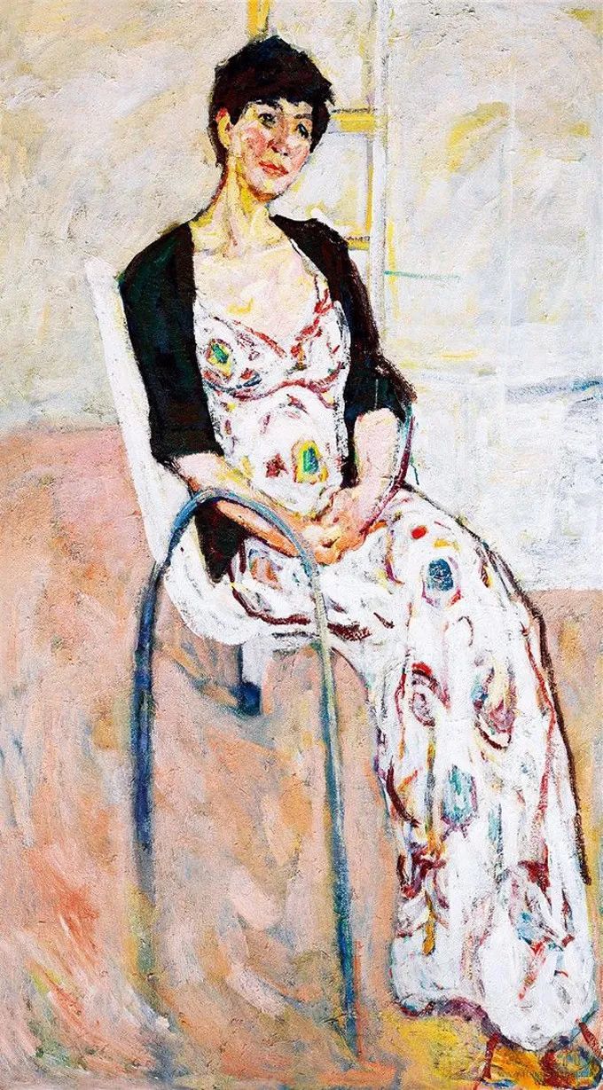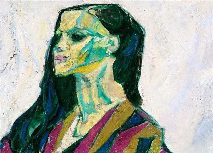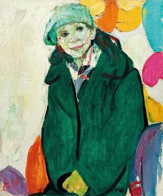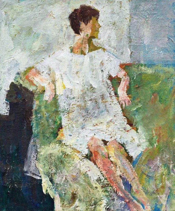 这幅绘于1987年的《绿衣女子》属其“塞尚式”艺术成熟期作品,画中人物面部以绿和粉表现明暗交接,变化极为细腻微妙,厚薄适中的圆润笔触具有强烈书写性,领口围巾用黑白灰概括,其余衣物、手、背景则以各色平涂。整幅画面洋溢着天真烂漫的气氛,隐约可以看出人物活泼开朗的性格特征。罗尔纯对色彩和造型的表达已臻化境,无愧水天中盛赞的“当代中国油画的色彩大师”。