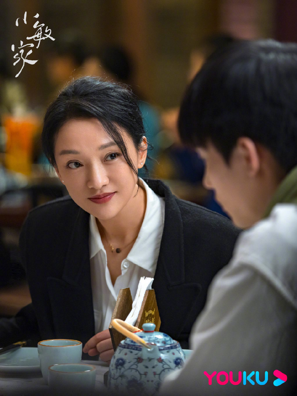 LOO3:黑色V领毛衣+白底蓝色圆点衬衣
