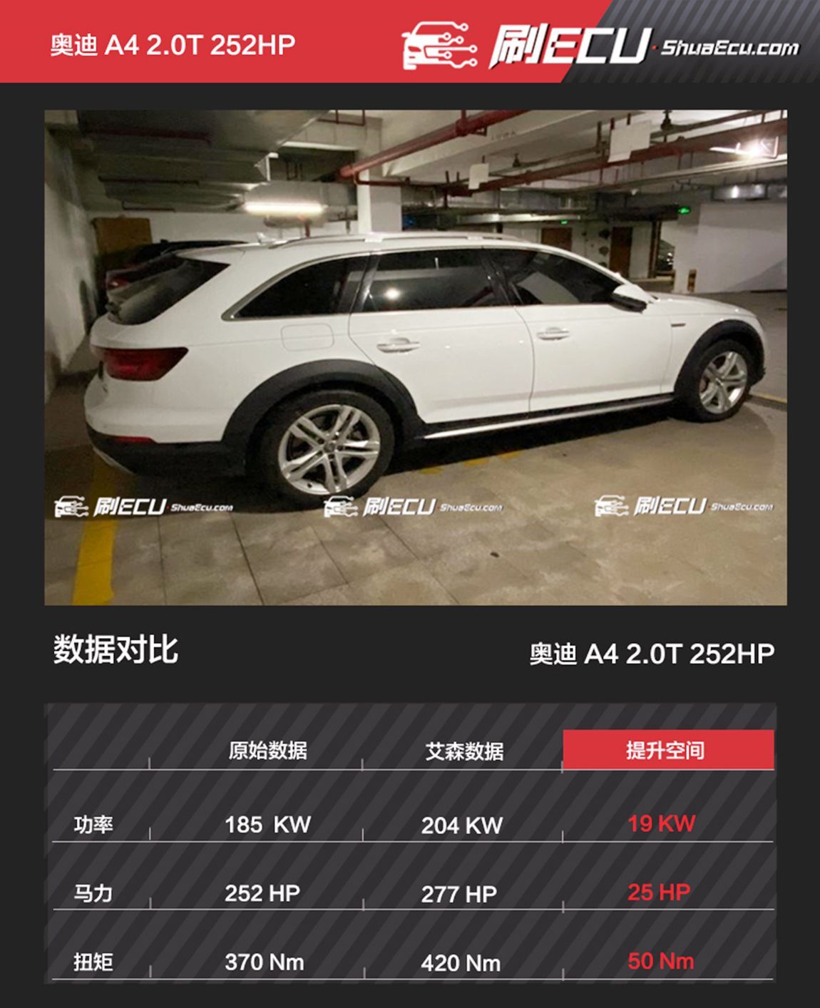 这台奥迪a4的原厂0~100加速是5.9秒。最大马力原厂252匹,最大扭矩370牛米。通过我们的调教,可以将这台车动力提高到280匹,扭矩提高到420牛米。其实动力的数值,还可以继续提升,但是对于这台车来说,马力提高28匹,扭矩提高50牛米是安全稳定可靠的范围,不下赛道不做重度改装的话,到这个数值就已经感觉到提升非常大了。刷ECU不是追求压榨到极限,是在原厂的安全范围内做一小步的扩展。