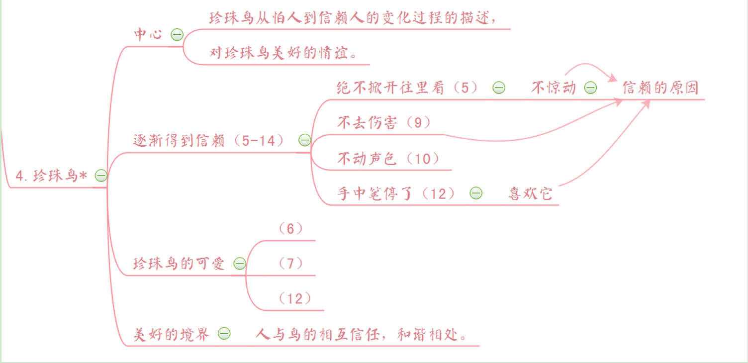 取得信赖的过程一共有四处,描写珍珠鸟可爱的句子,一共有三处。这里已经表明的十分清楚,对照自然段,在段落里是很容易找出来这些句子的。这里就不说的那么详细了。文章为了创造这种人与鸟和谐的境界,可是非常小心谨慎的。先是不惊动,、不去伤害逐渐慢慢的获得了信赖,表现了对珍珠鸟的喜爱。