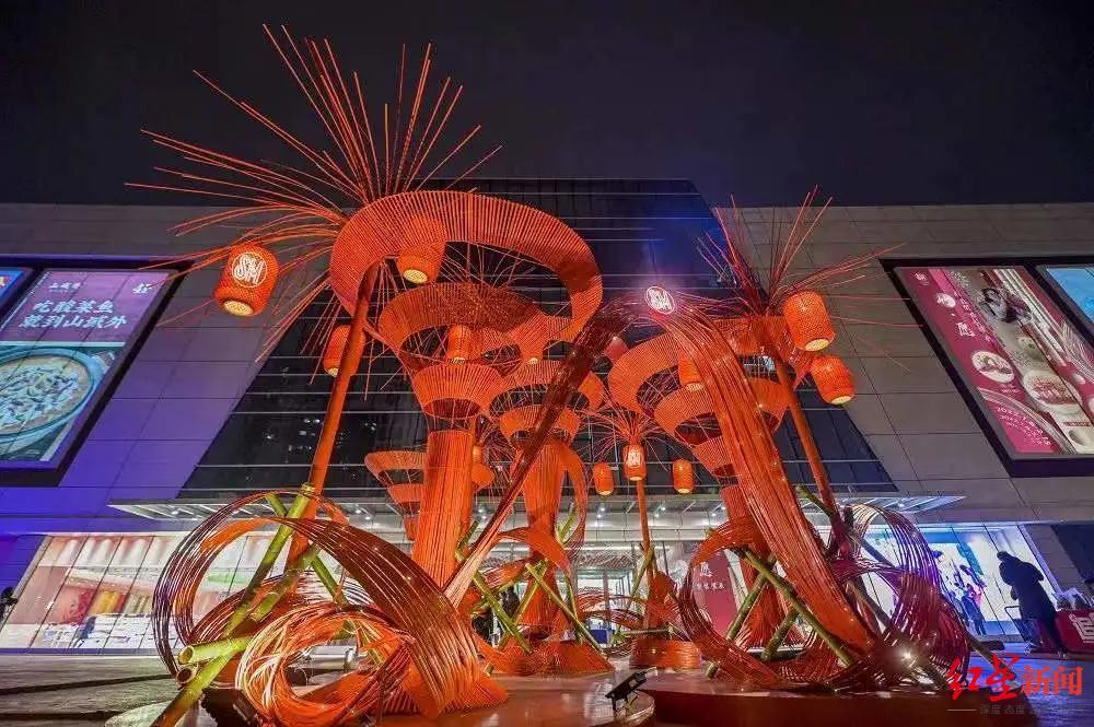 在SM广场外,全新的《竹·愿》非遗贺岁主题小品带来了虎年新风潮。它将“新年红+竹艺文化”的创意结合,以竹子创作的大型竹艺装置,顶端开花的“烟花竹”,装扮出了一个热闹喜庆的装置花园。在成华区龙湖三千集商圈,年味十足的天街庙会也营造出浓浓的节日氛围。近百把红色的油纸伞在这里形成了穹顶长廊,搭配花灯与灯笼小品,甚是好看!“红色代表喜庆,圆形灯笼和油纸伞则寓意团圆美满,这些小品很漂亮。”市民王阿姨向记者介绍道。