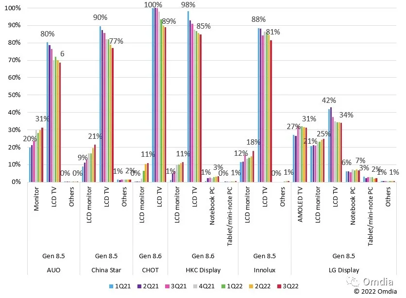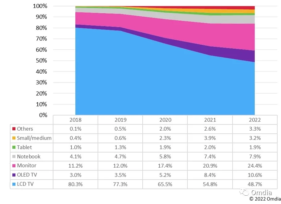 液晶电视曾经是8.5代面板产线最重要的产品,但到2022年将减少到占8.5代和8.6代产线总产量的50%以下。这一数字在2021年是54.8%。