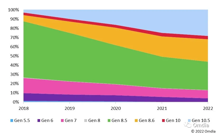 2021年,22.1%的电视面板由8.6代线生产;2022年,这一比例将上升到24.5%。