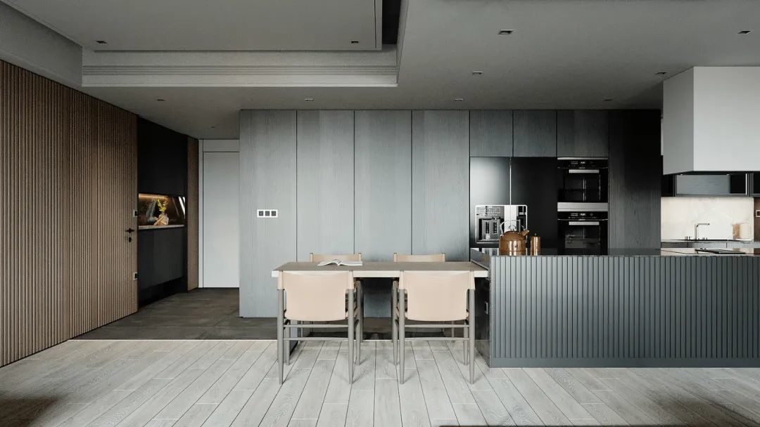 ▲在中岛台的后方,整面墙装上灰色的收纳柜,并在中间加入了嵌入式的电器柜,也是提供了一个实用优雅而端庄的烹饪料理体验。
