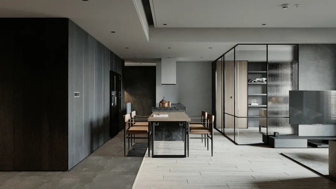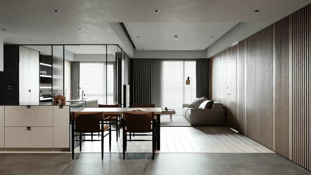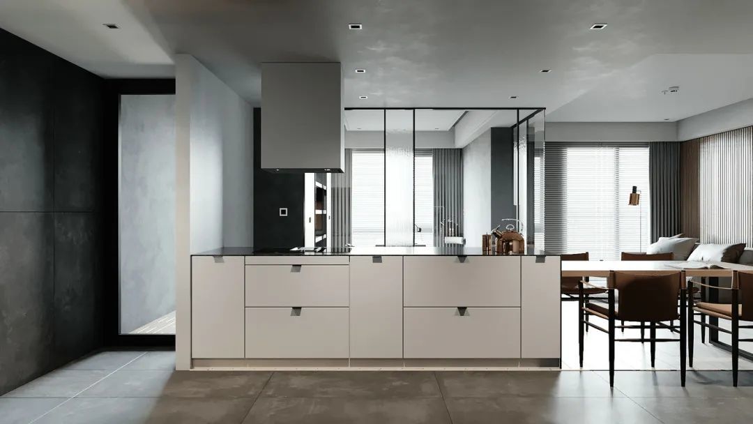 ▲客厅往后就是餐厅,在书房的玻璃墙与客厅落地窗的呼应下,使得餐厨空间格外的明亮、并且有着非常宽敞的视觉感,整个大厅区域的天花以吊平顶+无主灯的设计,也让空间显得简洁舒适而大气。