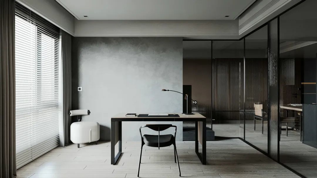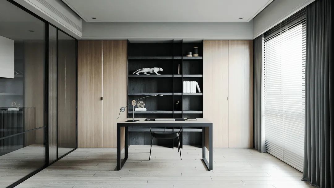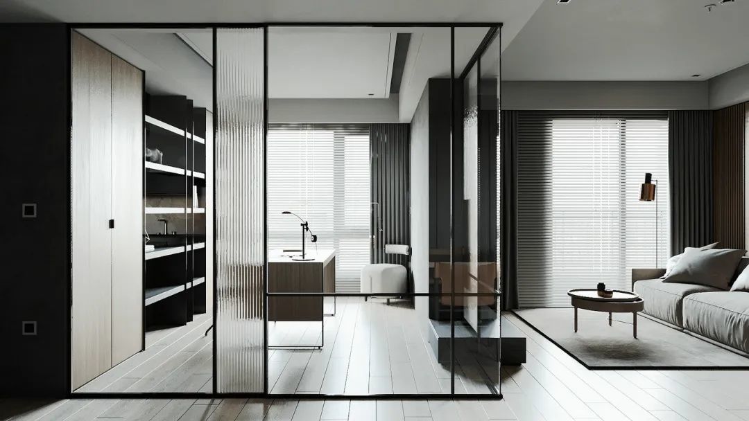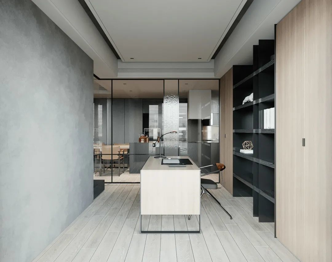 ▲书房采取双面玻璃隔墙的设计,并加入一道长虹玻璃来增加空间的分割感,书房内部空间通透明亮,即便在客餐厅也能一目了然。