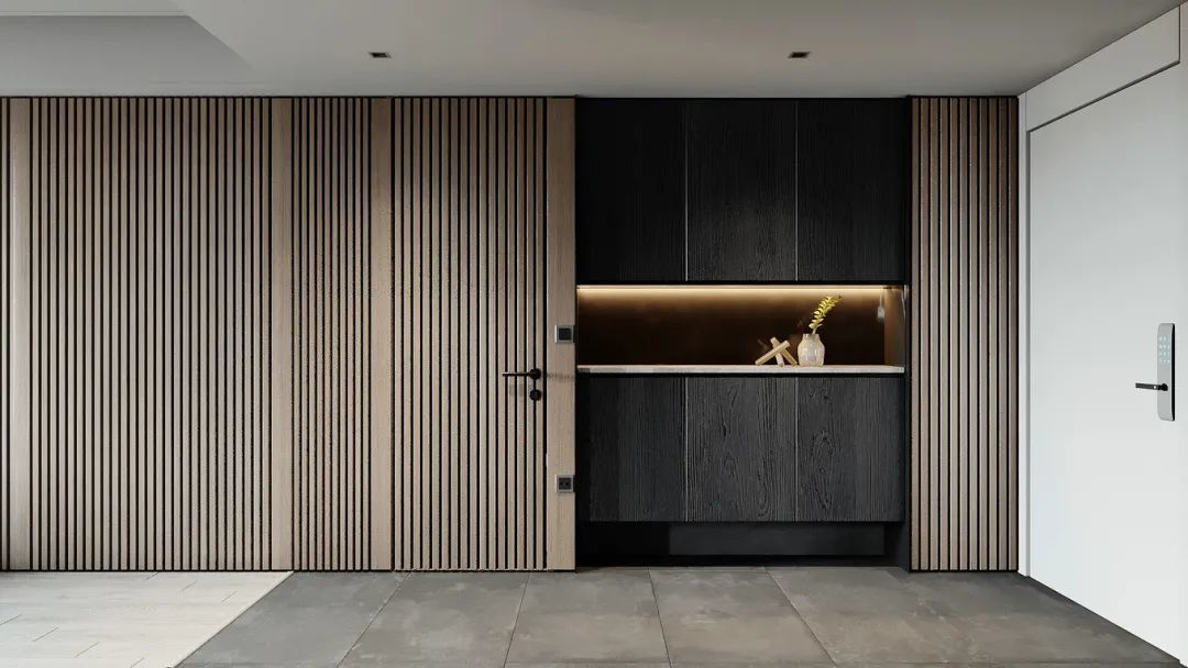 ▲玄关门后的墙面统一用长城板作为装饰,并在长城板墙面中间加入了一扇隐形门的设计,灰木色的鞋柜采取入墙式的设计,鞋柜中间留空层加入暗藏灯带,一进门就感受到了简约自在的空间感。