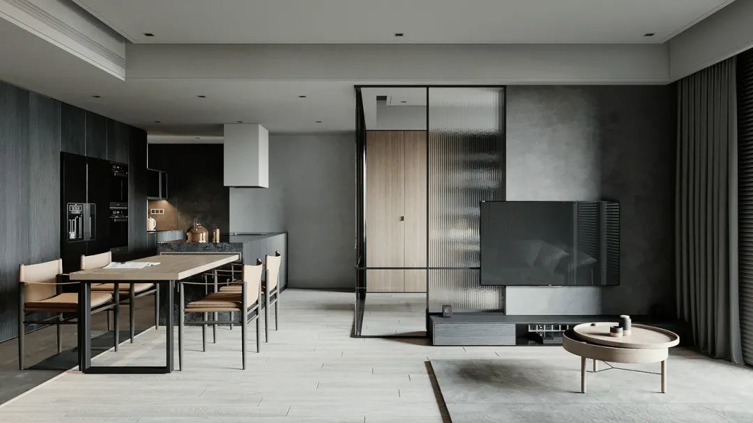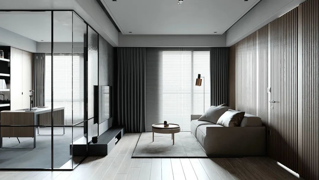 ▲客厅的电视墙采取玻璃隔墙+水泥灰色的背景墙组合,电视机壁挂上去,布置一张灰木色调的电视柜,营造出一种简约自然的空间感。