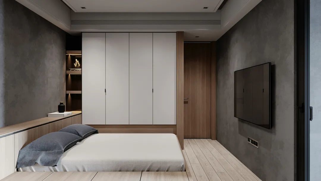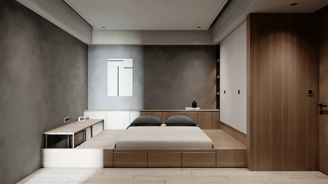 ▲卧室区域的墙面是水泥灰色的质感,采取定制地台床的设计,床头后装上抬高的抽屉柜、侧边衣柜与小台面,提供了灵活的床头柜功能;在灰色与木色的空间搭配下,显得格外的自然优雅。