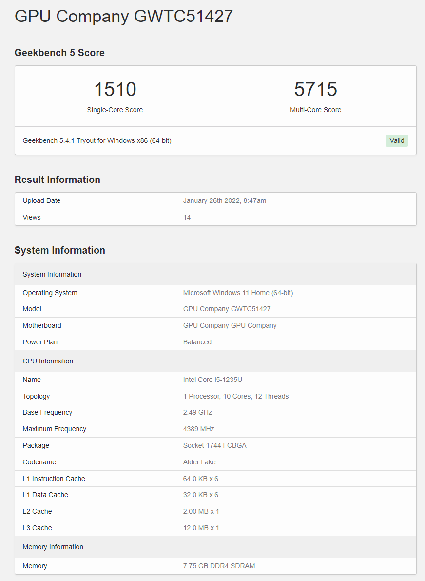 英特尔 i5-1235U 处理器在未知平台跑分,使用 Win11 系统,配备 8GB DDR4 内存。Geekbench 5 单核成绩 1510 分,多核 5715 分,其中单核性能远超前代产品,多核性能与 AMD R7 5700U 移动处理器相当。