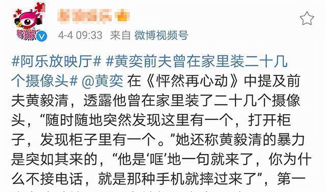 黄奕后来在节目里说,家里布满20多个摄像头,前夫随时会抬起手打她,黄毅清恐怖的控制欲让黄奕完全不敢和朋友联系。