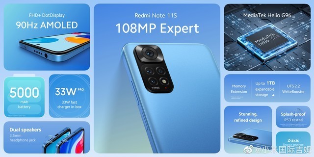 Redmi Note 11S配备联发科 Helio G96,拥有FHD+ 90Hz AMOLED,搭载5000mAh大电池+33W快充,后置主摄为一亿像素。