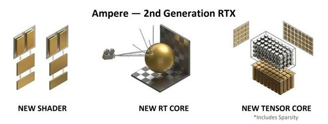 全新的Tensor Core可自动识别并消除不太重要的DNN权重,处理稀疏网络的速率是Turing的两倍,算力高达73 TensorTFLOPS。