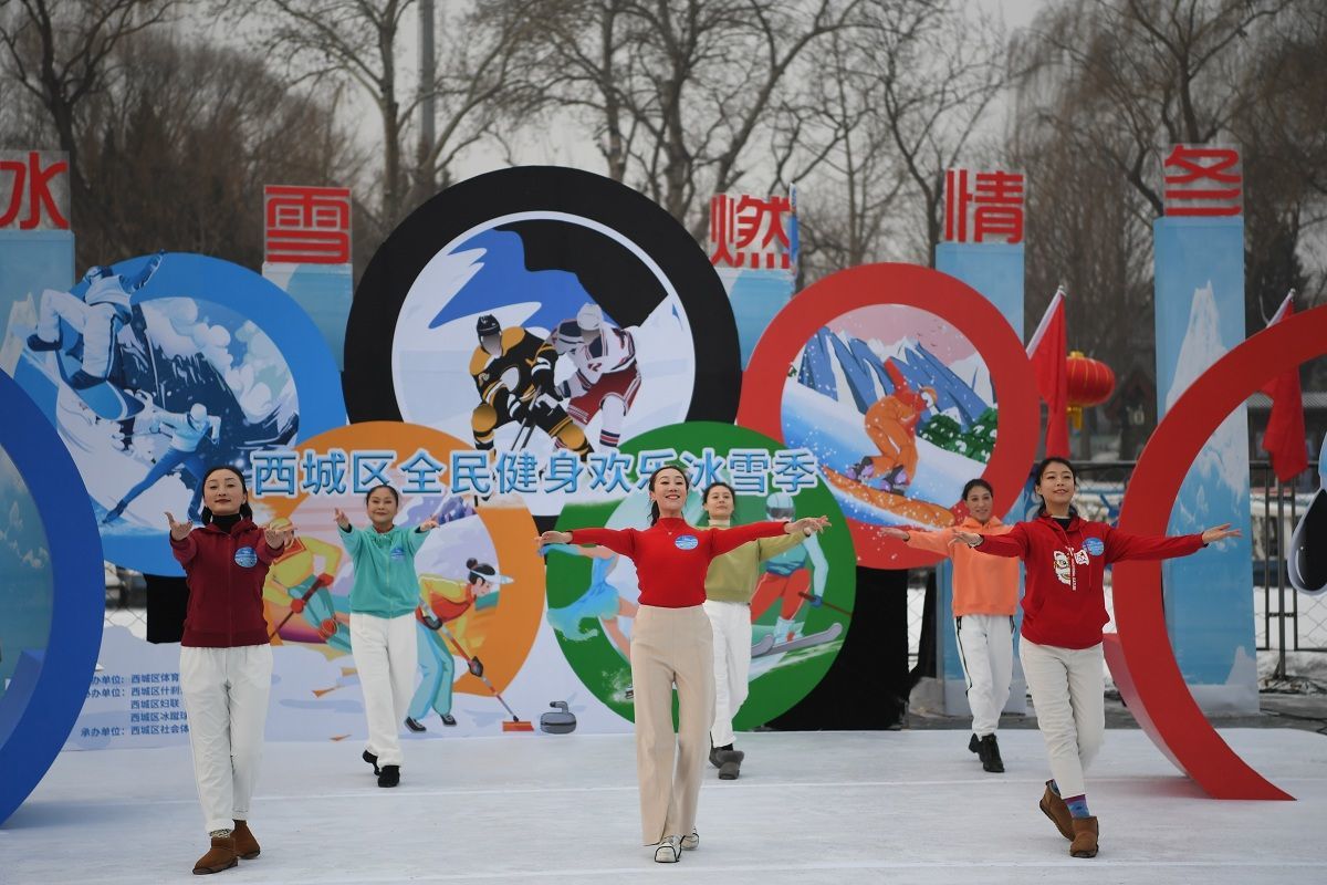 ▲2022年1月25日,北京西城区什刹海,志愿者们表演了舞蹈《一起向未来》。当天,2022年西城区全民健身欢乐冰雪季正式启动。新京报记者 王嘉宁 摄