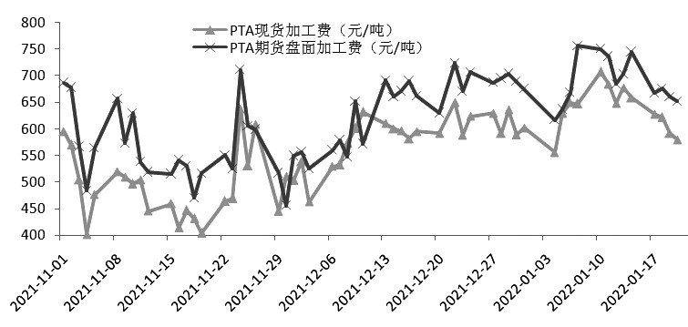 去年12月20日以来,PTA现货加工费在550—700元/吨之间振荡,PTA期货盘面加工费大部分时间在600—750元/吨区间波动。价格上涨并未带来PTA生产利润的同步上升,说明PTA的基本面并没有明显的改善。